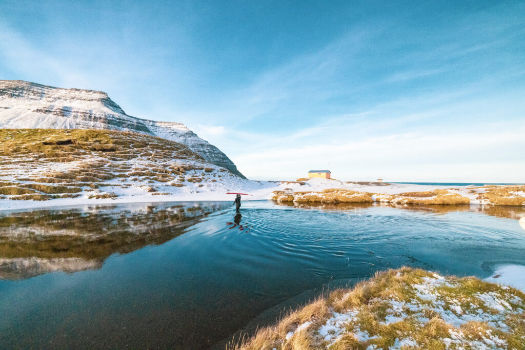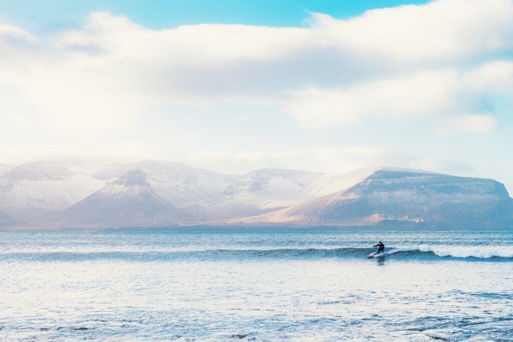 Once in and with that initial duck dive behind you, the water temperature is quickly forgotten, you’ve acclimatised and start to take in the beauty around you. Crisp blue skies overhead are propped up by snow covered peaks, flanked on either side by fjords bathed in dramatically shifting light. The pace at which the odd seal head curiously pops up and down at a healthy distance is only matched by how quickly the weather moves through. It is a raw, edgy, and humbling experience, but one that connects you with the natural elements in a way that is incomparable in my experience. The hard yards and effort in the build-up are soon forgotten and you’re able to ride that post-surf high for hours, or all the way back to Reykjavik in my case.