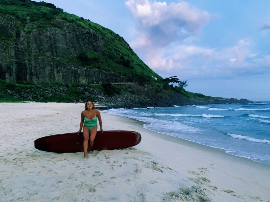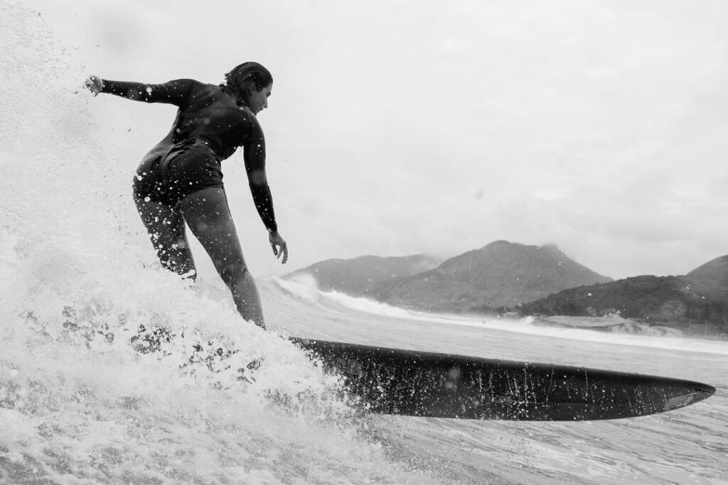After a few morning surfs and a continuous exchange of bom dias, I was granted a temporary spot in the line-up, which with time became a rather homely place to be. The community is welcoming and warm, and amid the crowd, I was lucky to meet a couple of talented characters who have been in the spotlight of Brazilian longboard surfing for years. One of those names is Ayllar Cinti, a 26-year-old born and bred Recreio local, professional surfer with a loving personality. Ayllar stumbled upon surfing when she was 10 years old and began competing at 15. Since then, she gained the support of many Brazilian sponsors and has also established her own longboard-focused surf experiences in the northeast of Brazil — Saikesurf. Ayllar’s surf is vivid, loud and ever-pushing boundaries,- it is graceful yet aggressive.